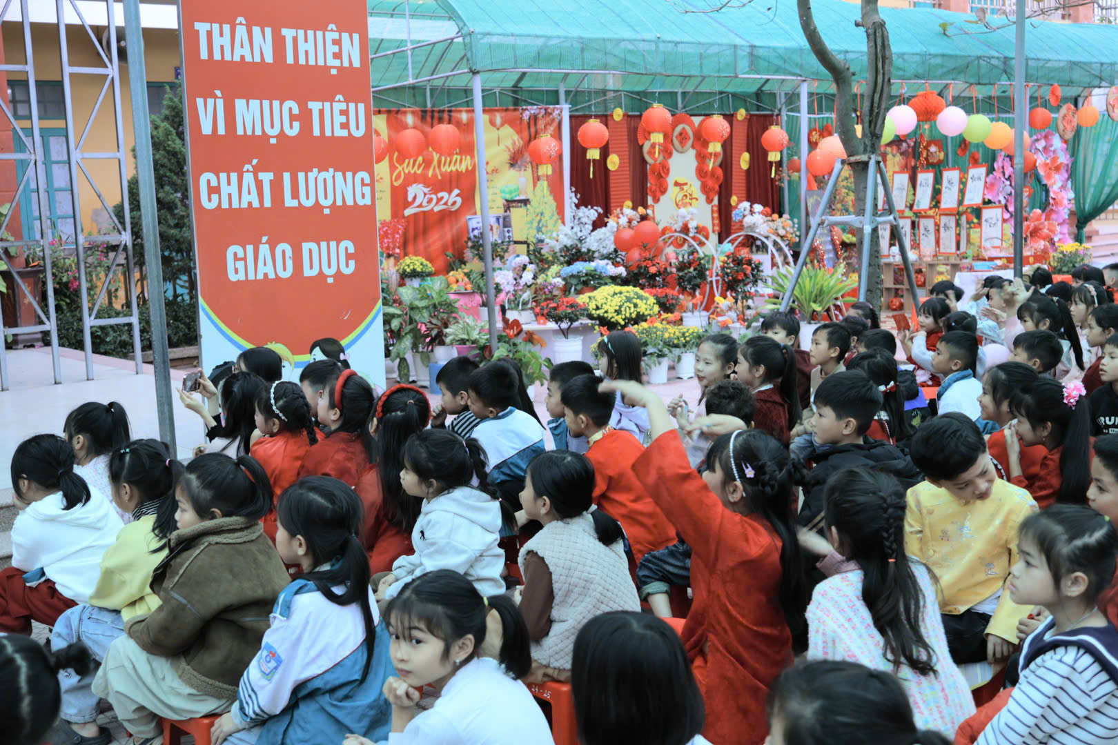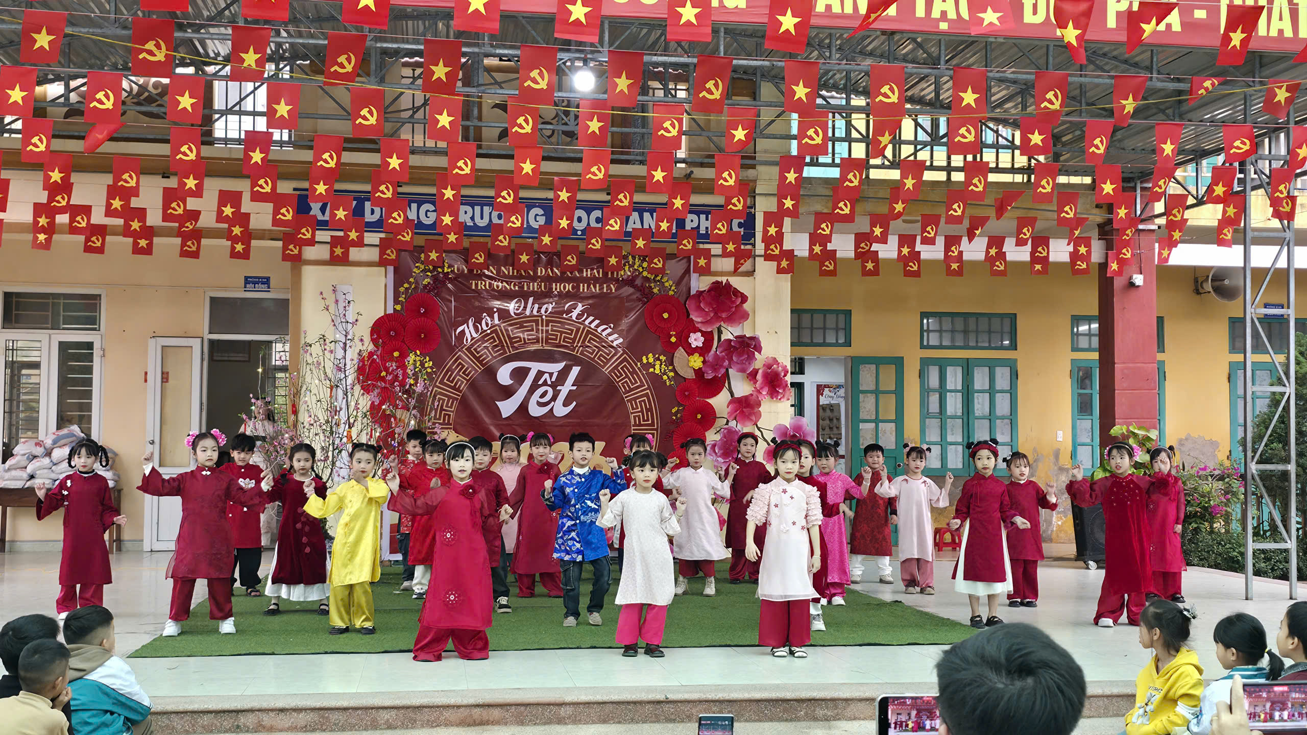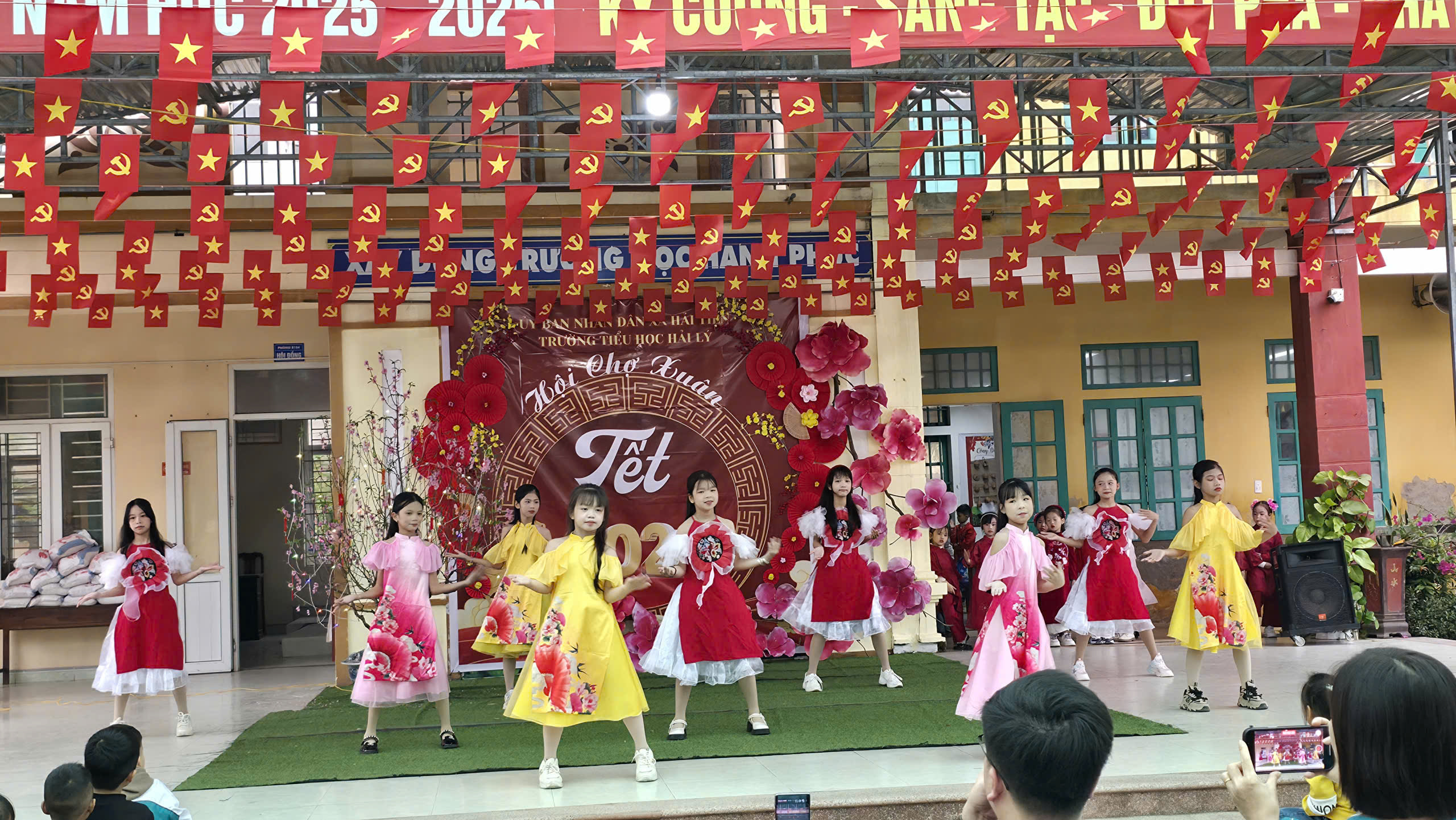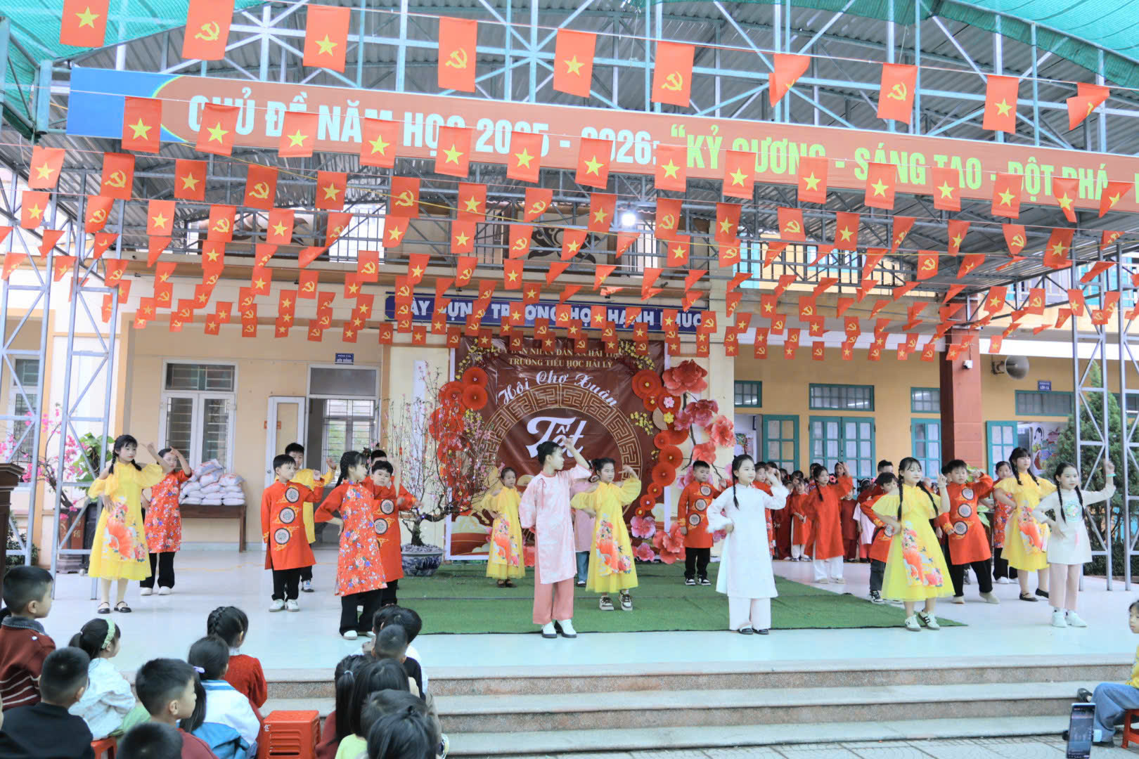 Ngay từ sáng sớm, khuôn viên nhà trường đã rực rỡ cờ hoa, sắc đỏ của câu đối, sắc vàng của mai đào và tiếng cười trong trẻo của học sinh. Mở đầu chương trình là những tiết mục văn nghệ đặc sắc do các em học sinh biểu diễn. Những điệu nhảy sôi động, tươi vui với chủ đề mùa xuân đã khuấy động bầu không khí, mang đến sự hào hứng và lan tỏa tinh thần mừng Đảng – mừng Xuân – mừng đất nước đổi mới.