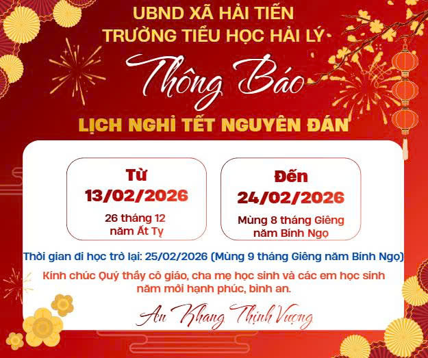 Căn cứ Công văn số 318/BGDĐT-VP ngày 19/01/2026 của Bộ Giáo dục và Đào tạo về việc tổ chức Tết Nguyên đán Bính Ngọ năm 2026; Thông báo số 9441/TB-BNV ngày 16/10/2025 của Bộ Nội vụ quy định lịch nghỉ Tết Âm lịch và Lễ Quốc khánh năm 2026 đối với cán bộ, công chức, viên chức và người lao động; Chỉ thị số 01/CT-UBND ngày 22/01/2026 của UBND tỉnh Ninh Bình về việc tổ chức Tết Nguyên đán Bính Ngọ năm 2026 đảm bảo vui tươi, lành mạnh, an toàn, tiết kiệm; Quyết định số 426/QĐ-UBND ngày 18/8/2025 của UBND tỉnh Ninh Bình ban hành kế hoạch năm học 2025–2026 đối với giáo dục mầm non, giáo dục phổ thông và giáo dục thường xuyên; Công văn số 327/SGDĐT-CTHSSV ngày 03/02/2026 của Sở Giáo dục và Đào tạo tỉnh Ninh Bình về việc tổ chức Tết Nguyên đán Bính Ngọ năm 2026, Trường Tiểu học Hải Lý thông báo tới quý phụ huynh và các em học sinh kế hoạch nghỉ Tết Nguyên đán của nhà trường: