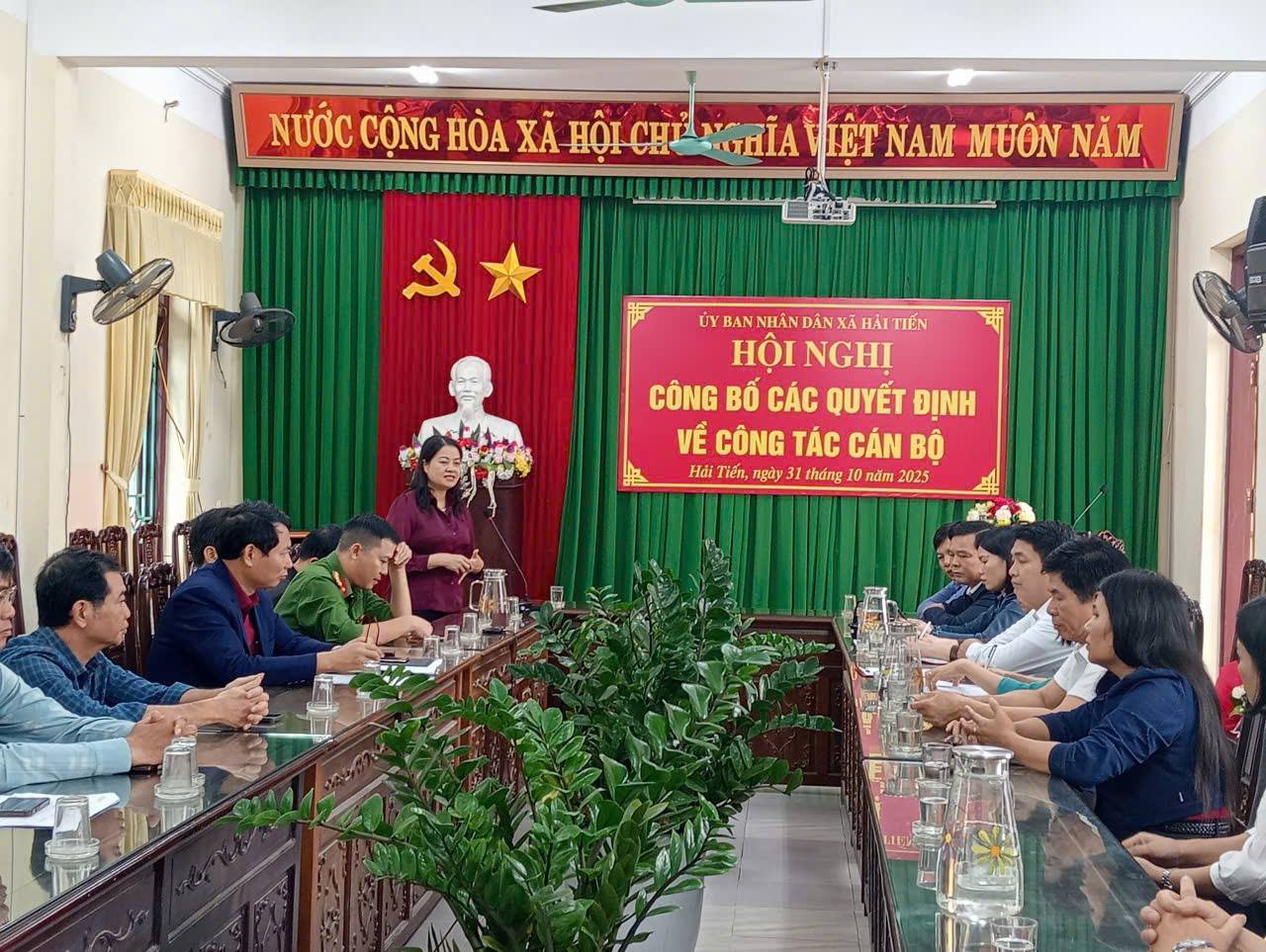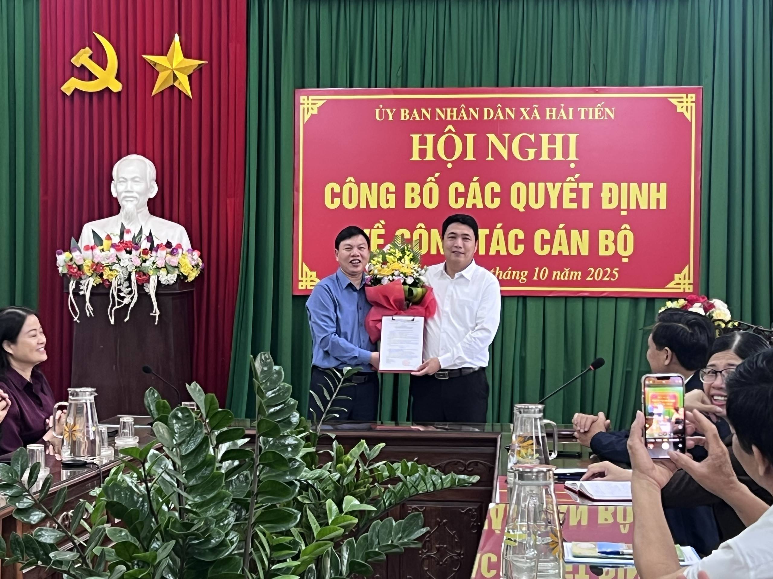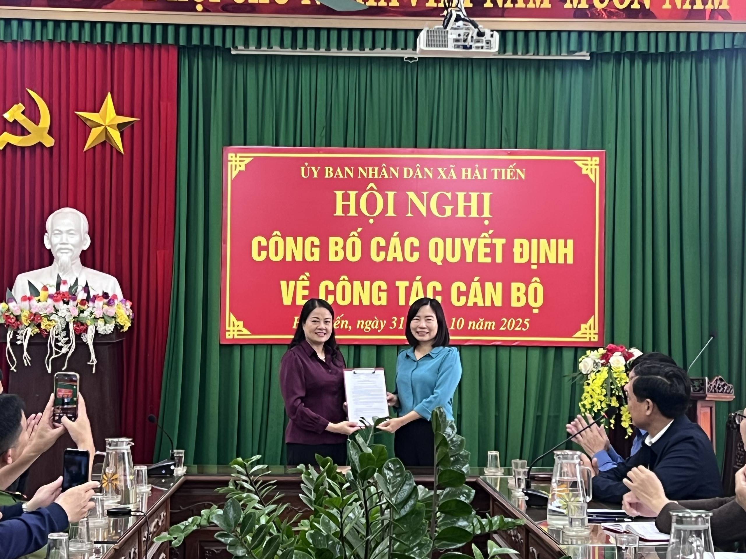 Hội nghị đã công bố các Quyết định của UBND xã Hải Tiến: Bổ nhiệm ông Bùi Mạnh Phong, sinh ngày 10/10/1988 hiện là chuyên viên Phòng Kinh tế xã Hải Tiến giữ chức vụ PhóTrưởng phòng Kinh tế xã Hải Tiến, tỉnh Ninh Bình. Thời hạn bổ nhiệm là 05 năm, kể từ ngày 01/11/2025; Bổ nhiệm bà Bùi Thị Thu Hà, sinh ngày 03/8/1974, hiện là Phó Hiệu trưởng trường Tiểu học Hải Lý xã Hải Tiến giữ chức vụ Hiệu trưởng trường Tiểu học Hải Lý xã Hải Tiến. Thời hạn bổ nhiệm là 05 năm, kể từ ngày 01/11/2025.