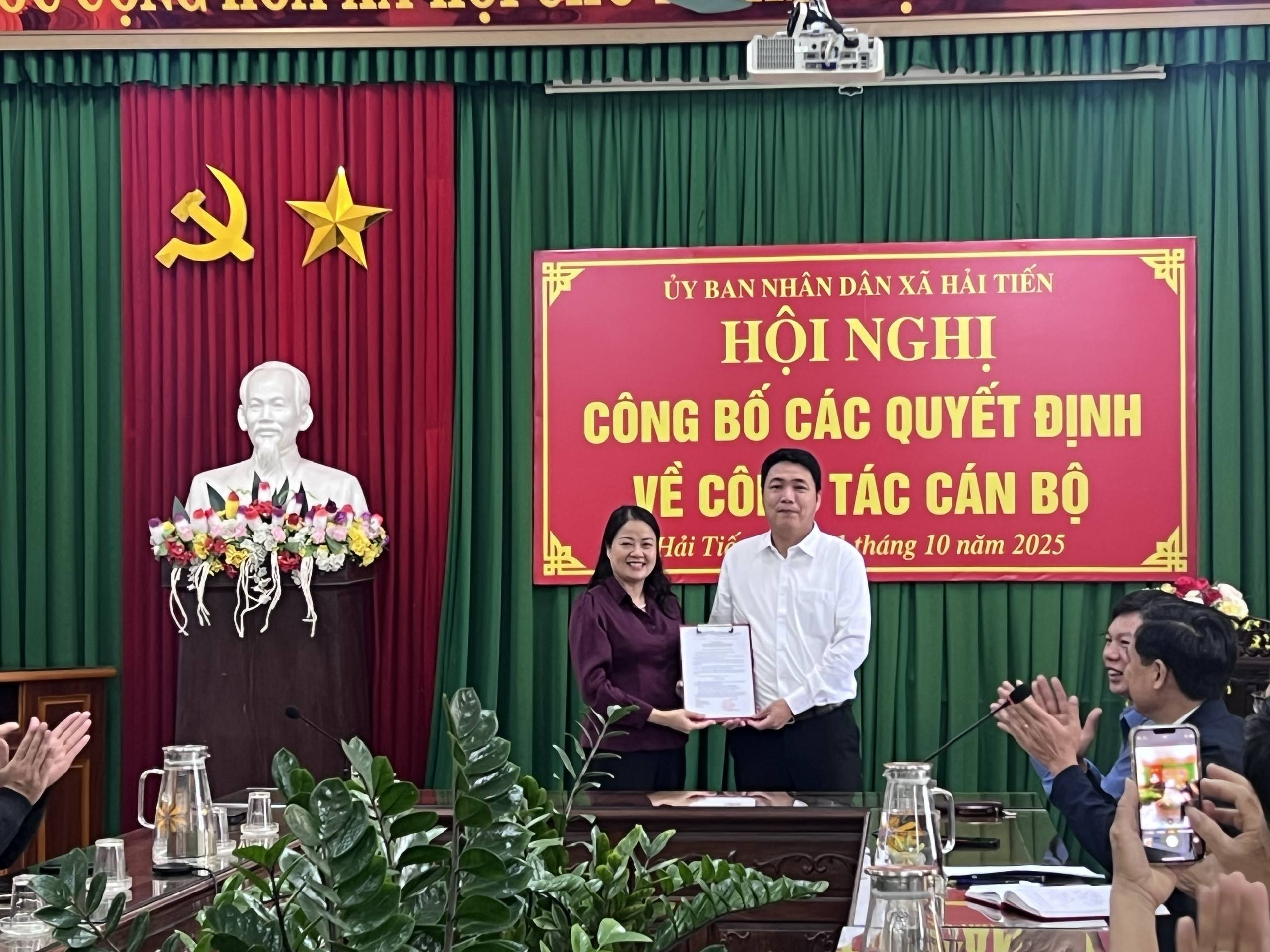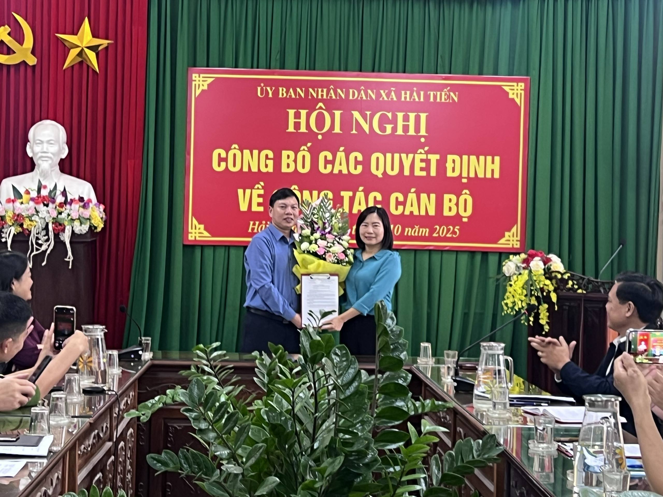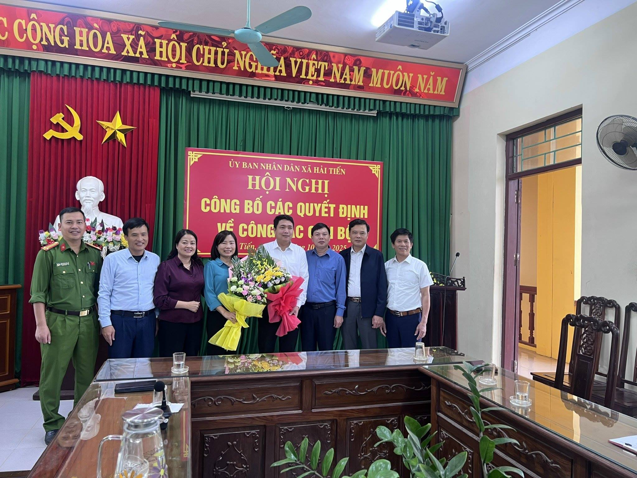 Hội nghị đã công bố các Quyết định của UBND xã Hải Tiến: Bổ nhiệm ông Bùi Mạnh Phong, sinh ngày 10/10/1988 hiện là chuyên viên Phòng Kinh tế xã Hải Tiến giữ chức vụ PhóTrưởng phòng Kinh tế xã Hải Tiến, tỉnh Ninh Bình. Thời hạn bổ nhiệm là 05 năm, kể từ ngày 01/11/2025; Bổ nhiệm bà Bùi Thị Thu Hà, sinh ngày 03/8/1974, hiện là Phó Hiệu trưởng trường Tiểu học Hải Lý xã Hải Tiến giữ chức vụ Hiệu trưởng trường Tiểu học Hải Lý xã Hải Tiến. Thời hạn bổ nhiệm là 05 năm, kể từ ngày 01/11/2025.